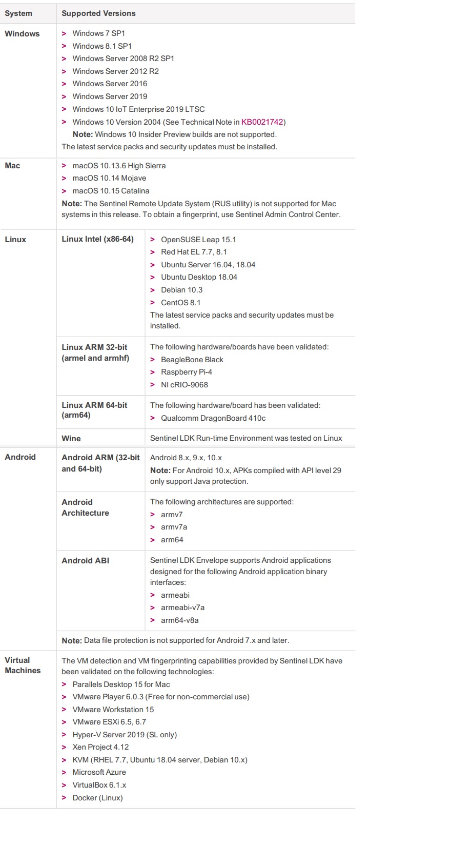Sentinel LDK8.0支持的操作系統